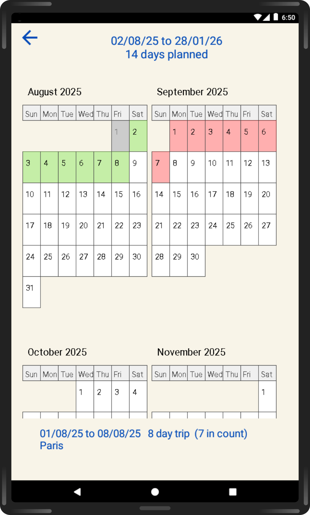 New! You can now view a scrollable 180-day calendar graphic showing all trips in any selected 180-day period (here shown on an Android 10-inch tablet):