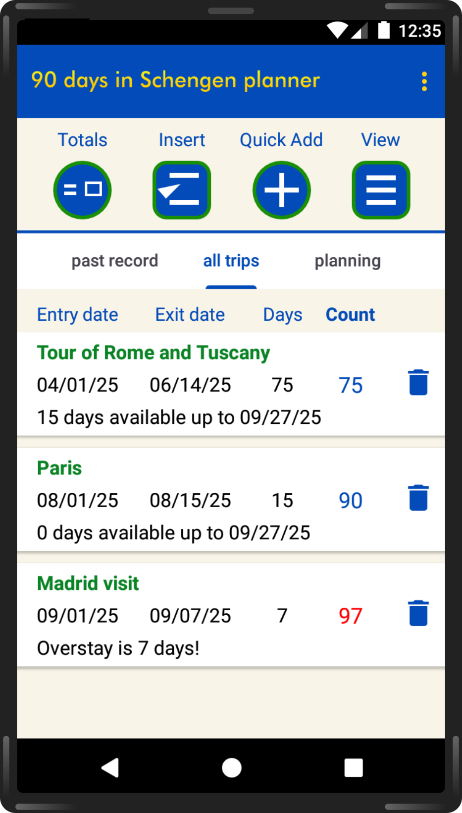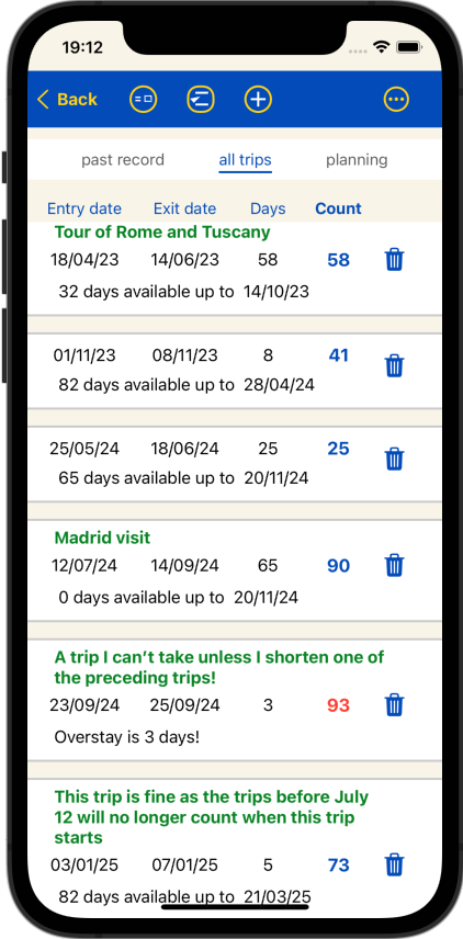 The app makes planning simple by showing when previous trips expire and for how many days you could still stay after each planned trip. You can adjust trip lengths, and add or insert trips in any order. You can switch between scrolling through the calendar and typing in dates for the Android version, or using the date wheel for iOS, so you can easily add the tour of Europe which you're planning for 3 years time!